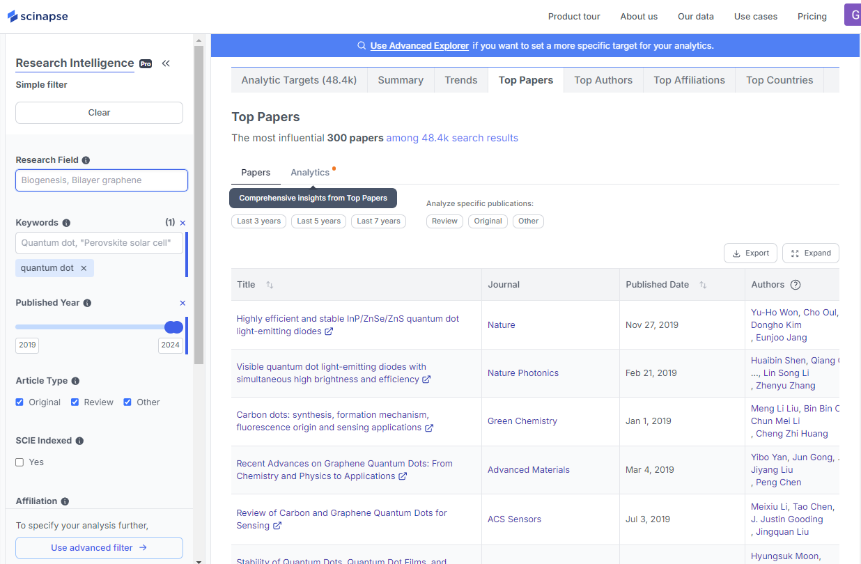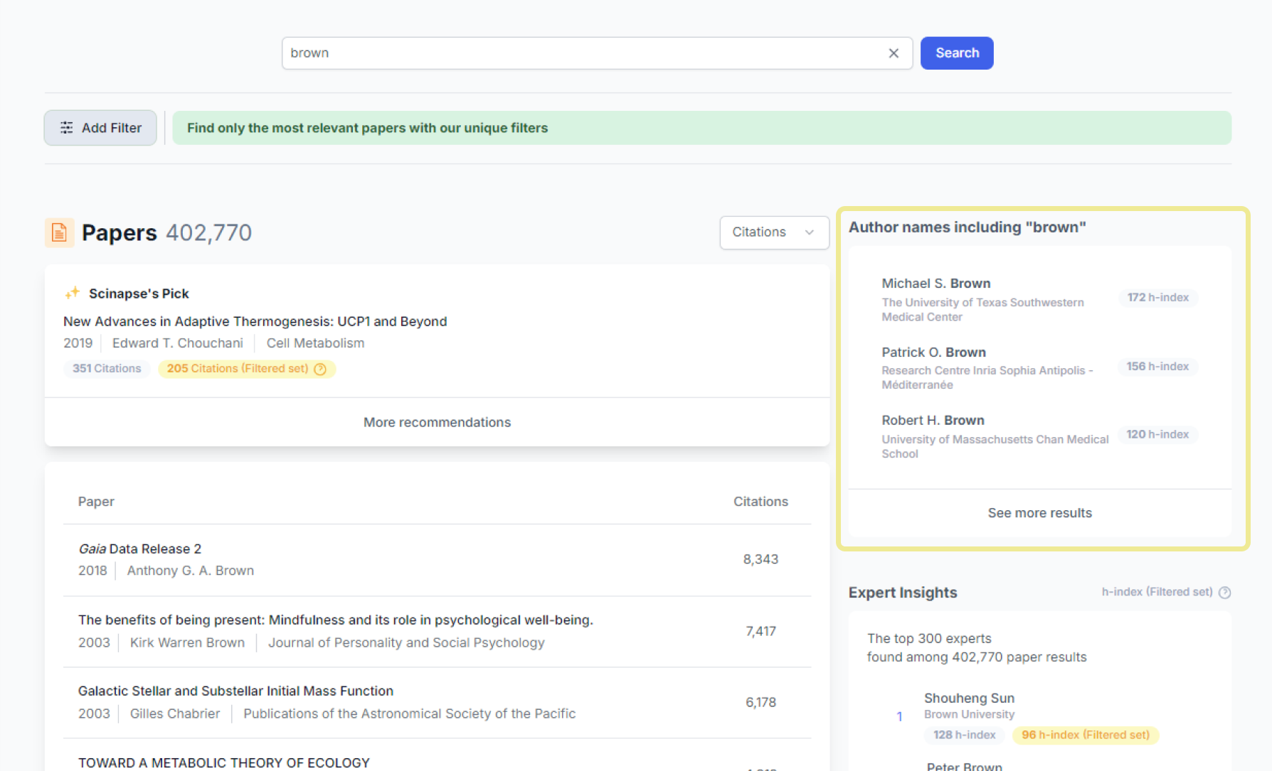 In the newly introduced Expert Insights section, you can see the top 5 most influential authors based on their h-index, combined with information from your search filters (filtered h-index). This feature analyzes the impact of authors within your search results. Through your chosen fields or keywords, you can discover both papers and influential authors (The unique advantage of Scinapse!).