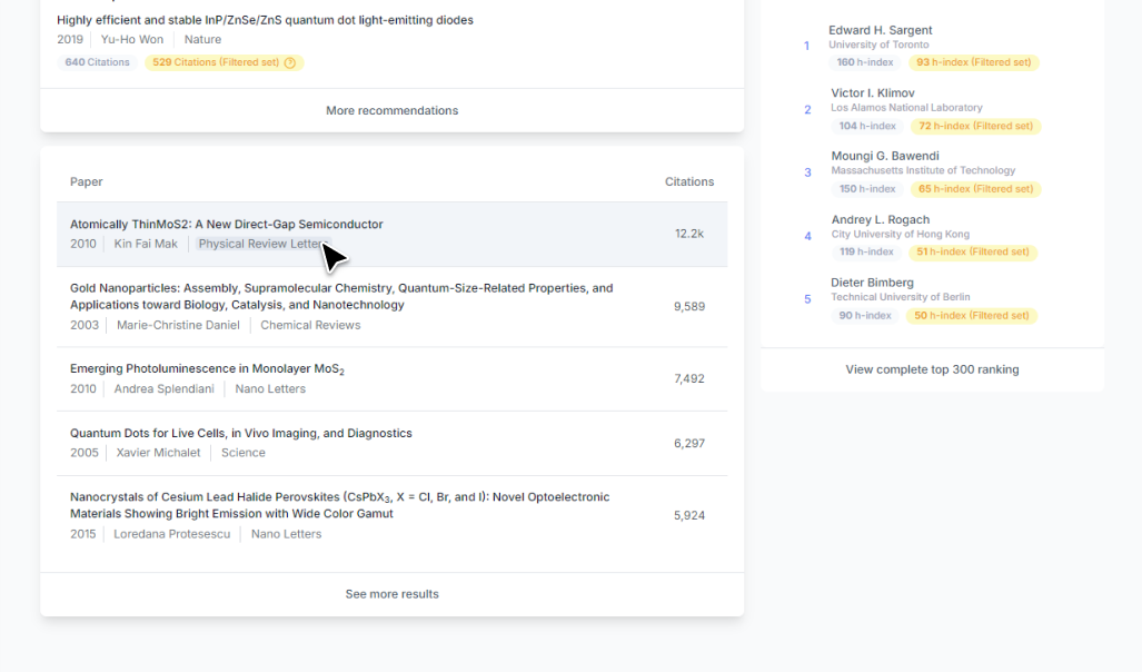 If you want to have a comprehensive look at the top papers, click "More Recommendations" under Scinapse’s Pick.