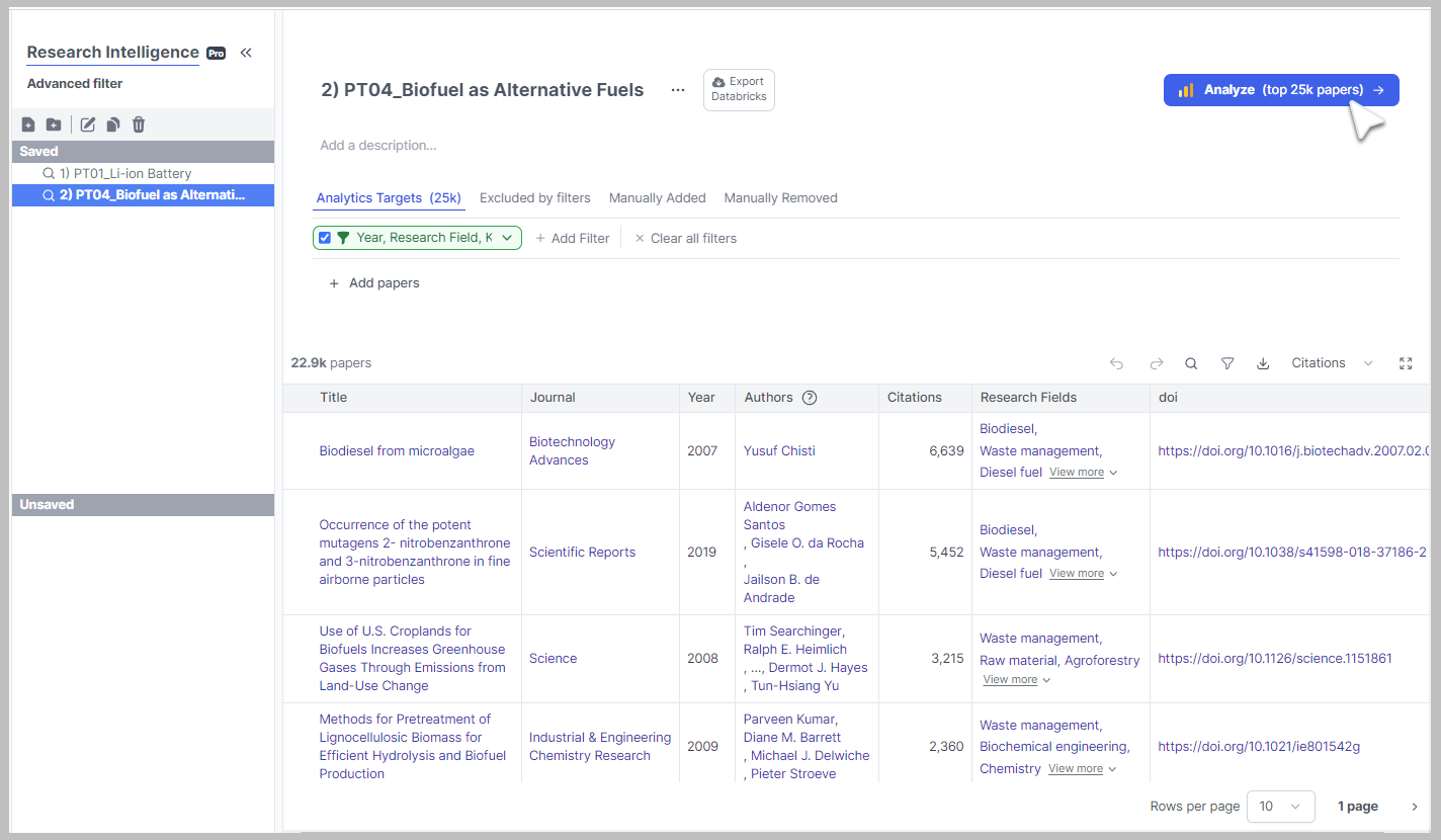 On clicking the “Analyze” button from Research Intelligence page (in below), a detailed information about biofuels research publications is available specific to liquid fuels - petroleum alternative fuels. This provides a better approach in determining the top-ranked research of a specific field for a mentioned duration.