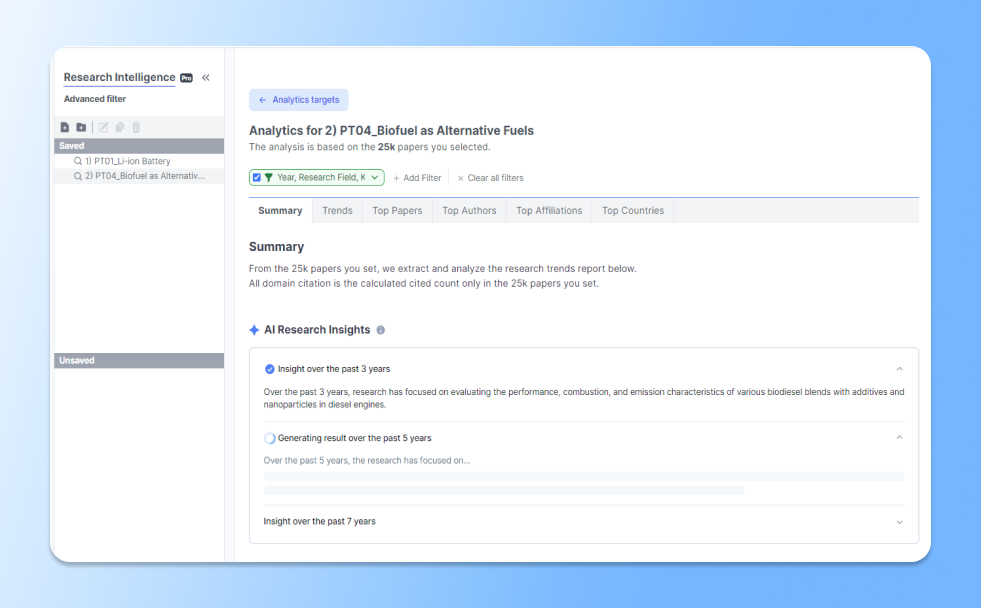 Scinapse's Research Intelligence Advanced Filter allows users to add and edit various filters according to their research objectives. This enables not only searching for the right paper but also gaining insights into advanced research trends.