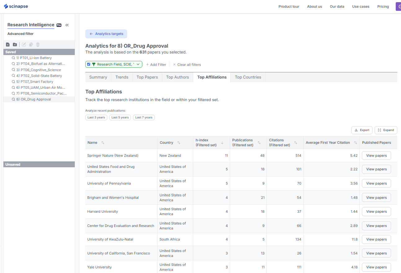 Scinapse's Research Intelligence Advanced Filter allows users to add and edit various filters according to their research objectives. This enables searching for the right paper and gaining insights into advanced research trends.