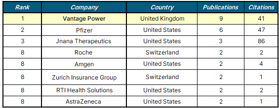 Among top affiliations, excluding universities, hospitals, and research institutions, the UK-based commercial company Vantage Power ranked first with 9 publications. Although Vantage Power primarily focuses on designing and manufacturing innovative battery packs, its life sciences subsidiary, Evaluate Vantage, frequently publishes research reports and analyses on pharmaceutical industry trends and drug approvals. These reports also include data on regulatory shifts post-pandemic and evaluate various therapies, such as small molecules, biologics, and cell therapies. Through comprehensive analysis, they help stakeholders make strategic resource allocations and prioritize decisions based on market trends, emerging therapeutic areas, and projected sales potential.