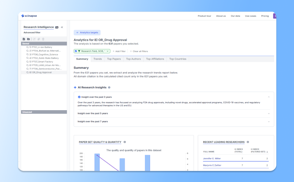 Originally, Scinapse's Advanced Research Intelligence Filter provided research summaries for the past 3, 5, and 7 years. However, since the period covered this time is focused on the last 3 years, it offers concise research insights focusing on this shorter timeframe.