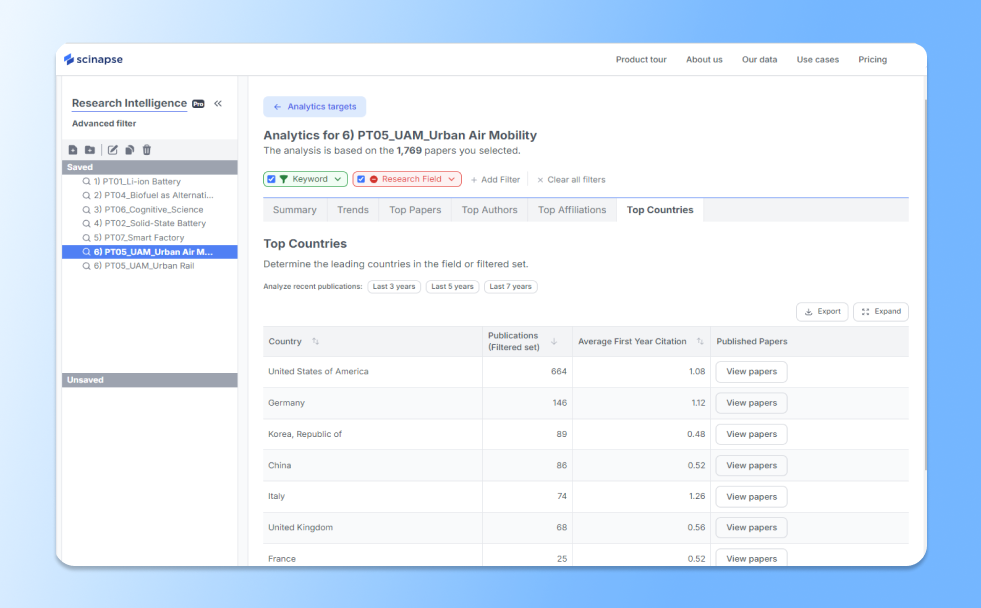 Thus, analyzing the research trends of UAM and Urban Rail is meaningful in identifying new opportunities for urban transportation network design and urban development, as well as predicting the direction of technological advancements. In this Scinapse Trends series, we aim to explore the publication concentrations over the past seven years to see which countries have conducted the most research.