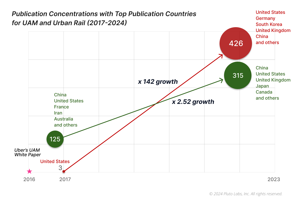 Trends in Publication Concentrations and Top Publication Countries for UAM and Urban Rail (2017-2024)