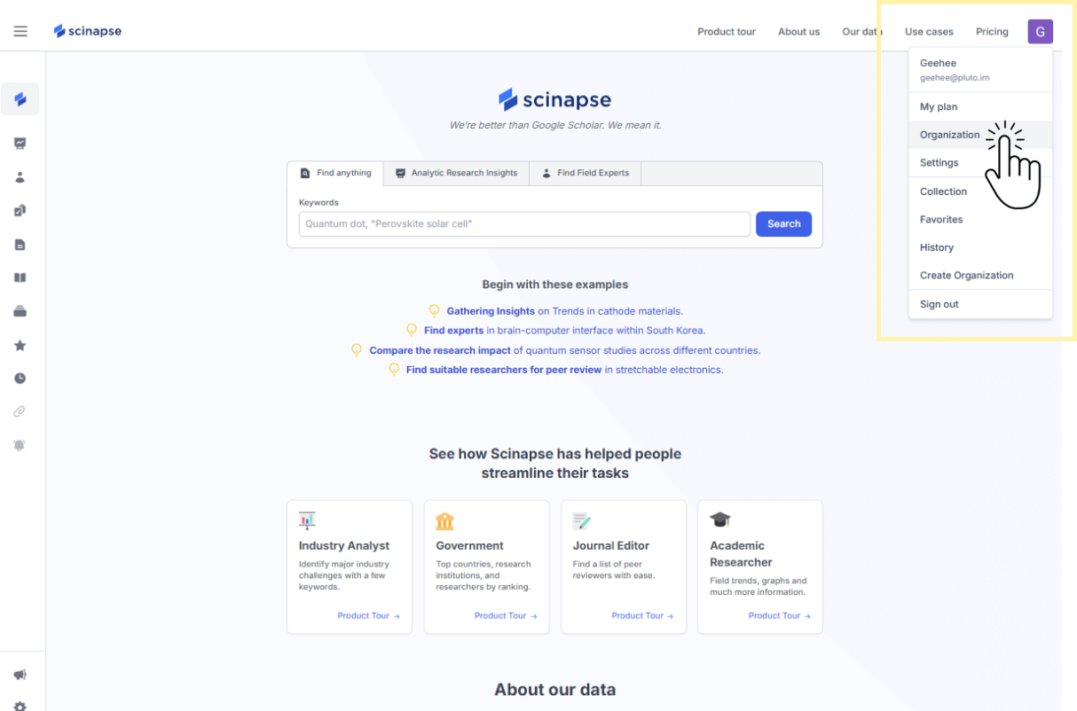 A: The "Organization" feature enables teams or companies to manage subscriptions, invites, and payments from a single dashboard. We created it to meet the needs of large, fast-growing research teams using Scinapse. By simplifying management and billing, it helps ease the challenges users often face with complex organizational needs.